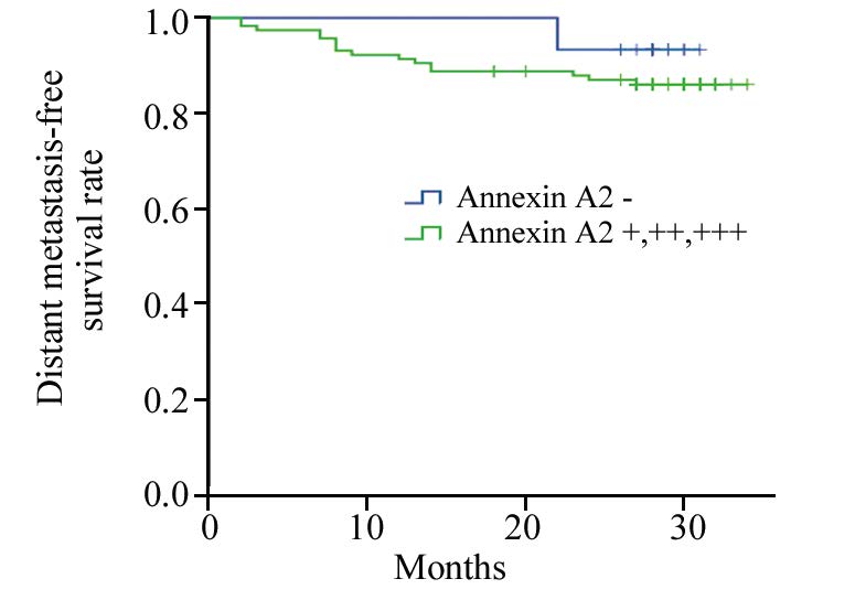 Annexin A2阴性表达(-)患者的远处转移率较低6.7%(1/15),阳性表达(+,++,+++)的患者的远处转移率为13.8%(16/116),两组比率差异无统计学意义(P=0.430)。Annexin A2阴性表达和阳性表达的2年无远处转移生存率分别为93.3%和87.9%(P=0.462),虽然差别无统计学意义,但两组生存曲线能够较好的拉开,见图 3。