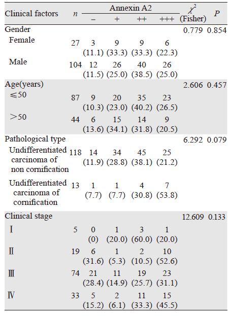 Annexin A2 在鼻咽癌组织中的表达阳性率为92.4%(121/131),但表达水平与患者的性别、年龄、病理类型、临床分期等无明显相关性(P>0.05),见表 1。