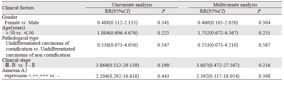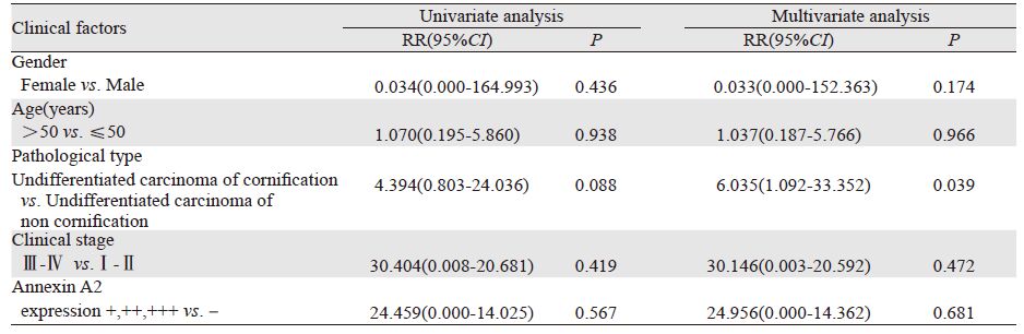 本研究单因素分析结果表明性别、年龄、病理类型、临床分期和Annexin A2与鼻咽癌患者的局部复发和远处转移无关,可能与随访时间较短有关;所以除病理类型是鼻咽癌患者无局部复发生存时间的独立预后因素外,多因素分析也未证明其他几个因素是鼻咽癌患者的局部复发和远处转移的危险因素。今后的研究通过延长随访时间将有助于明确这些因素与局部复发和远处转移的相关性。