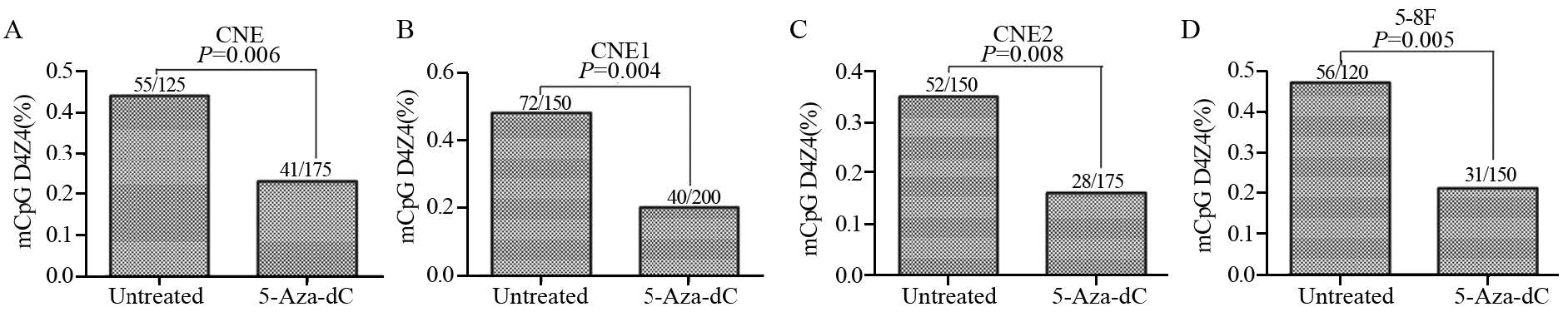 2 结果 2.1 5-Aza-C处理后鼻咽癌细胞亚端粒区甲基化水平降低四株鼻咽癌细胞系的亚端粒区D4Z4上均检测到不同程度的DNA甲基化,甲基化水平约在35%~48%之间,但四种细胞之间的甲基化水平无明显差异。2.5 μmol/L 5-Aza-C处理后,亚端粒区D4Z4序列的甲基化水平明显下降,约在15%~20%之间,与处理前的甲基化水平相比差异均有统计学意义(CNE、CNE1、CNE2、5-8F的P值分别为0.006、0.004、0.008、0.005),见图 1。