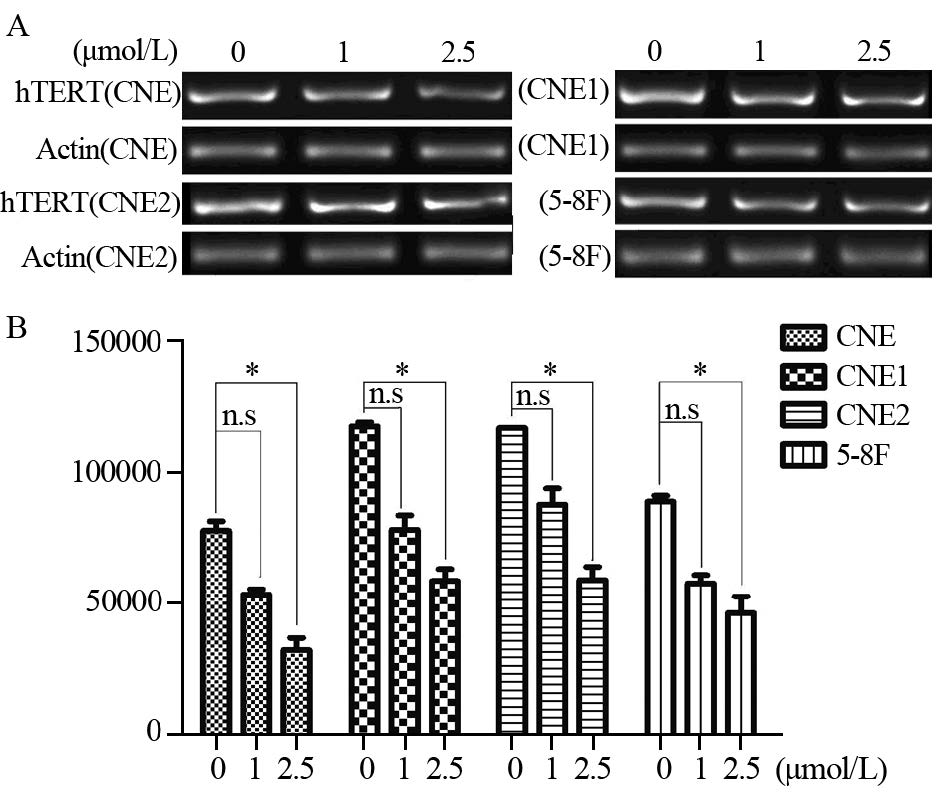1.4 RT-PCR检测hTERT mRNA水平细胞处理同1.2,根据操作说明用Trizol试剂提取总RNA,并用紫外分光计测定其浓度。hTERT反转录引物为:上游5’-AAGTTTGGAAGAAC CCCACATT-3’ ,下游5’-AGGATGGTCTTGAAG TCTGAGG-3’;反转录条件为:37℃ 2 h,70℃ 10 min。应用SYBR qPCR试剂盒扩增,hTERT PCR扩增:95℃预变性10 min,95℃ 15 min,58℃ 15 s,72℃ 45 s,40个循环,结束反应 。 PCR产物进行琼脂糖凝胶电泳,凝胶经胶片曝光后,采用Scion图像分析软件对结果进行分析,各组实验重复3次。