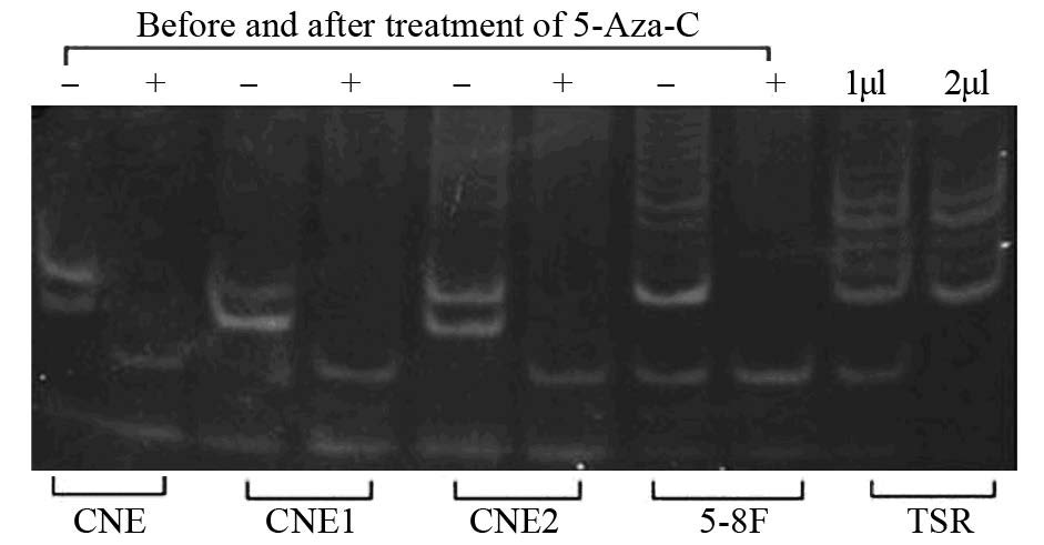 1 材料与方法 1.1 实验材料及主要试剂鼻咽癌CNE、CNE1、CNE2及5-8F细胞系由本实验室保存。RNA提取试剂Trizol(美国Invitrogen公司),反转录-聚合酶链反应(RT-PCR)试剂盒(美国Thermo Scientific公司),10%小牛血清及DMEM细胞培养液(美国Hyclone公司),DNA提取试剂盒(QIAamp DNA Mini Kit,德国Qiagen公司),EpiTect亚硫酸氢盐试剂盒(法国Qiagen公司),SYBR qPCR试剂盒(日本TaKaRa公司),TRAPeze 端粒酶检测试剂盒(美国Millipore公司)。