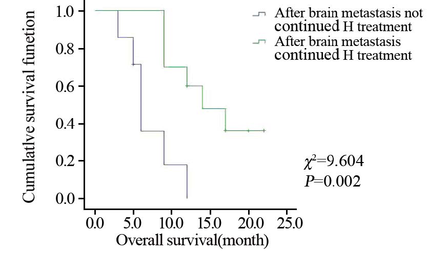 | 图 4 HER2阳性晚期乳腺癌脑转移后继续曲妥珠单抗治疗和未继续使用曲妥珠单抗的OS Figure 4 Comparison of OS between patients treated with continued trastuzumab treatment and those without continued trastuzumab treatment after brain metastasis |