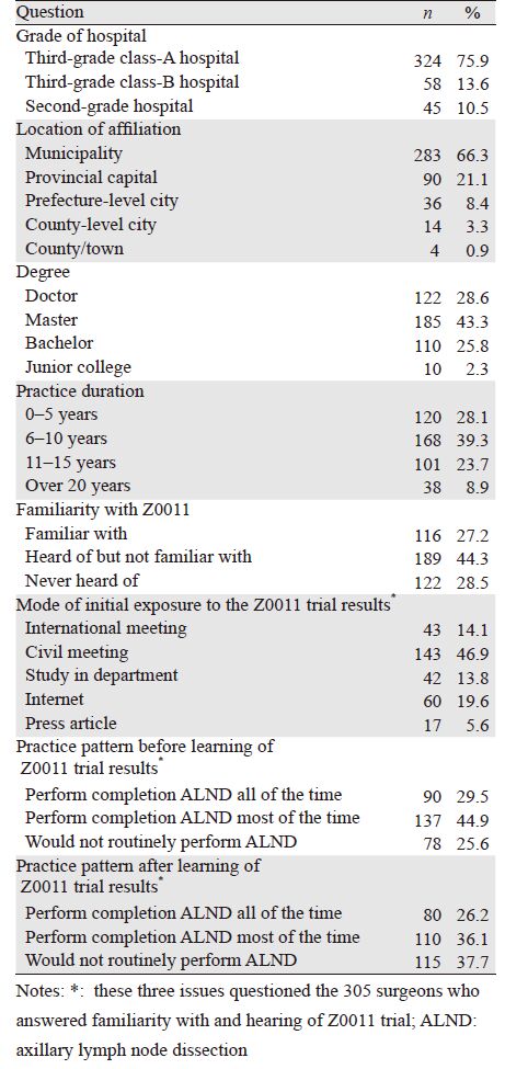 2 结果 2.1 调查问卷结果本研究共收到完整有效的反馈问卷427份,问卷反馈率为60.6%(427/704)。完成问卷调查的427位医生中,有324人(75.9%)来自三级甲等医院;283人(66.3%)来自直辖市,有90人(21.1%)来自省会城市;有307人(71.9%)具有研究生以上学历;从事专业10年以下的288人(67.4%),对Z0011试验熟悉的116人(27.2%),了解一些的189人(44.3%),不知道的122人(28.5%)。回答熟悉和了解一些的305位医生中,143人(46.9%)是通过国内会议获取有关Z0011信息,60人(19.6%)通过网络的方式得到Z0011的信息。有90位(29.5%)在知道Z0011试验结果之前,对于临床T1~2期、前哨淋巴结有1~2个转移、行保乳手术、准备术后接受全乳放疗和全身辅助治疗的乳腺癌患者,137位(44.9%)医生绝大多数情况下会做ALND,78位(25.6%)不会常规做ALND。在知道Z0011试验结果之后,对于上述乳腺癌患者,有80位医生(26.2%)常规行ALND,110人(36.1%)绝大多数情况下会做ALND,115人(37.7%)不会常规做ALND,问卷详细结果见表 1。