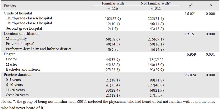 三级甲等医院的医生较三级乙等和二级医院的医生对Z0011试验更为熟悉;直辖市、省会城市的医生较地、县级医生更为熟悉Z0011试验;具有博士学位的医生熟悉Z0011试验的比例要高于硕士及本科或以下学位的医生;从事专业时间大于10年的医生要较10年以下医生更熟悉Z0011试验,差异都具有统计学意义(P<0.05),见表 2。