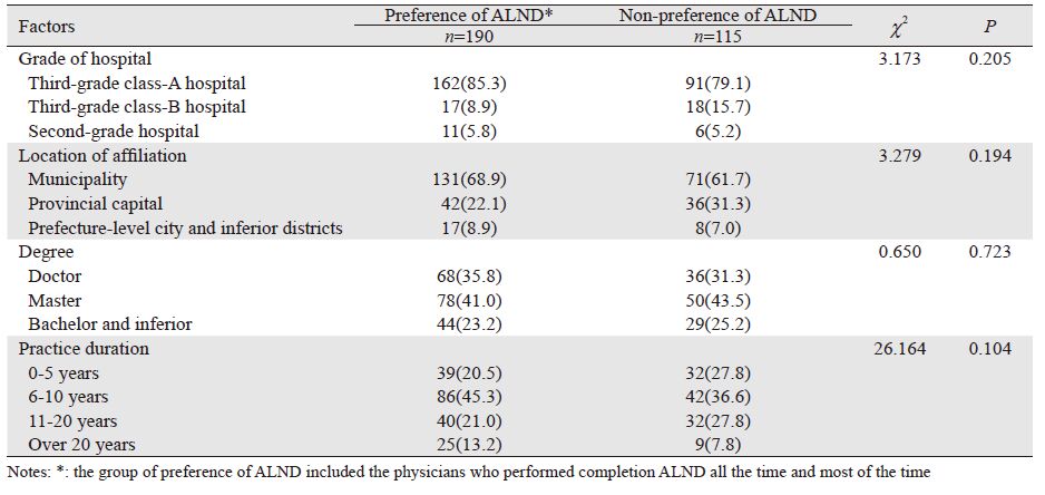 本研究对在问卷中回答对Z0011试验熟悉和了解的305位医生进行了进一步分析,将医生的一般情况与医生在知道Z0011试验结果之后对SLN阳性乳腺癌腋窝外科处理方式的意见之间进行了相关性分析,结果发现差异都没有统计学意义(P>0.05),即无论医生所在医院级别,医院所在地区,医生的学位,从业时间,对于符合Z0011试验入组条件的SLN阳性乳腺癌,这些医生选择还是不选择ALND差异无统计学意义,见表 3。