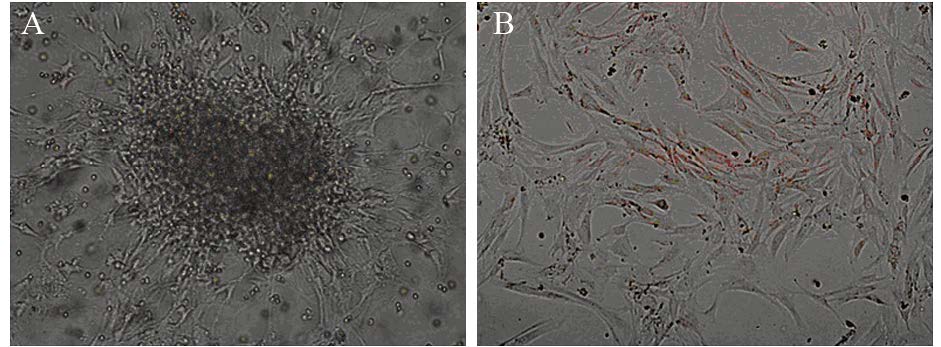 | 图 1 来源于高级别胶质瘤患者原代细胞传代前(A)传代后(B)培养图 Fig. 1 Culture of primary cells from patients with high-grade gliomas before(A) and after(B) passage |