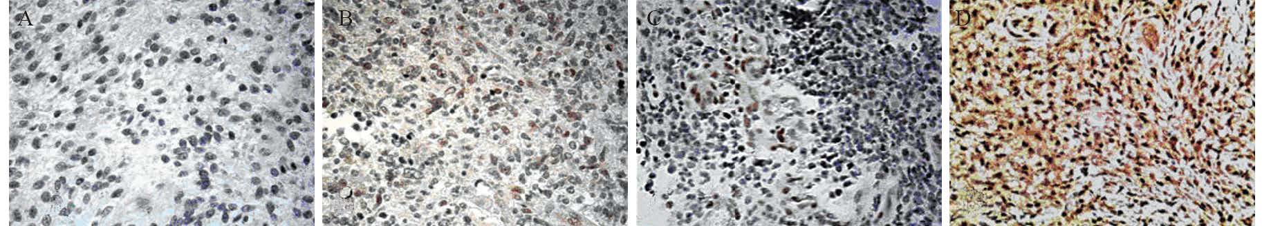 | A: patient 1: anaplastic astrocytoma,WHOⅢ. MGMT (-); B: patient 4: anaplastic astrocytoma ,WHOⅢ. MGMT (+); C: patient 5:glioblastoma multiforme,WHOⅣ. MGMT (++); D: patient 3:glioblastoma multiforme,WHOⅣ. MGMT (+++) 图 2 高级别胶质瘤免疫组织化学染色法检测MGMT的表达 Fig. 2 MGMT expression in high-grade glioma cells detected by immunohistochemical staining |