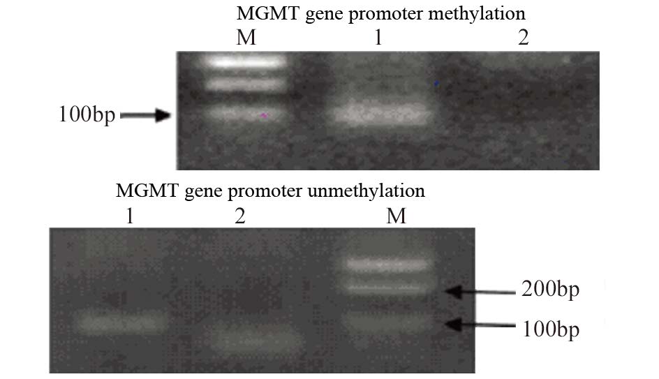| M: Marker; 1: treated sample DNA,unmethylated primers; 2: treated sample DNA,methylated primers 图 3 甲基化特异性PCR法检测MGMT基因启动子甲基化状态 Fig. 3 MGMT promoter methylation status detected by MSP |