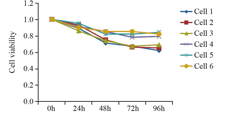 | The inhibition rate of TMZ on tumor cells reached to the maximum after 72h and the survival rate decreased to the minimum 图 5 高级别胶质瘤细胞时间—存活率曲线 Fig. 5 Time-survival curves of high-grade glioma cells |