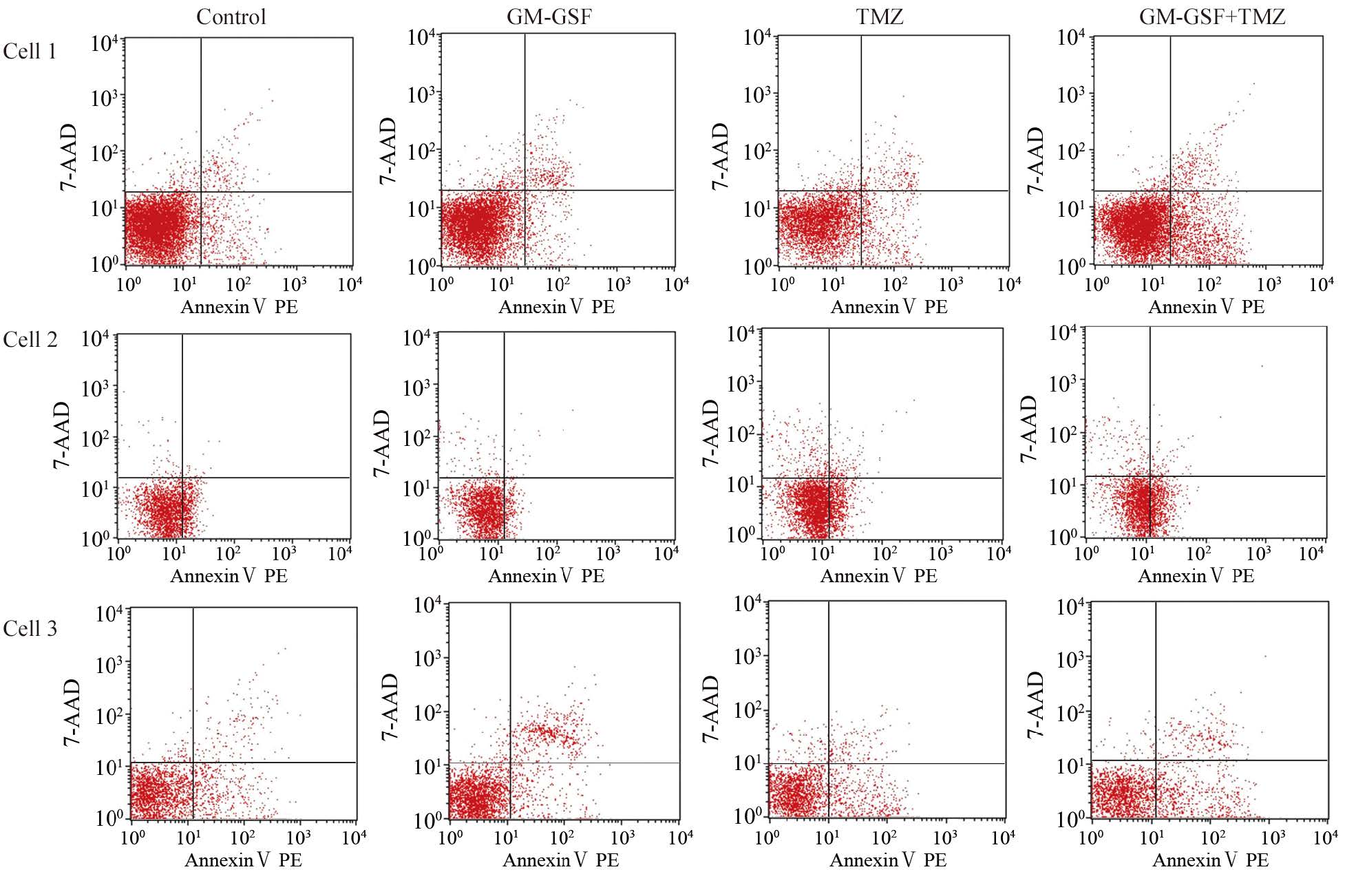1.6 流式细胞仪检测细胞凋亡率将细胞悬液以5×105接种于25 cm2培养板,设置对照组、GM-CSF组、TMZ组、GM-CSF联合TMZ组,在对应的分组先加入GM-CSF使其终浓度为20 ng/ml,12 h后加入TMZ使其终浓度为100 μmol/L。48 h后胰酶消化并收集细胞,凋亡试剂盒(PE Annexin V Apoptosis Detection Kit 1)染色处理后上机检测。