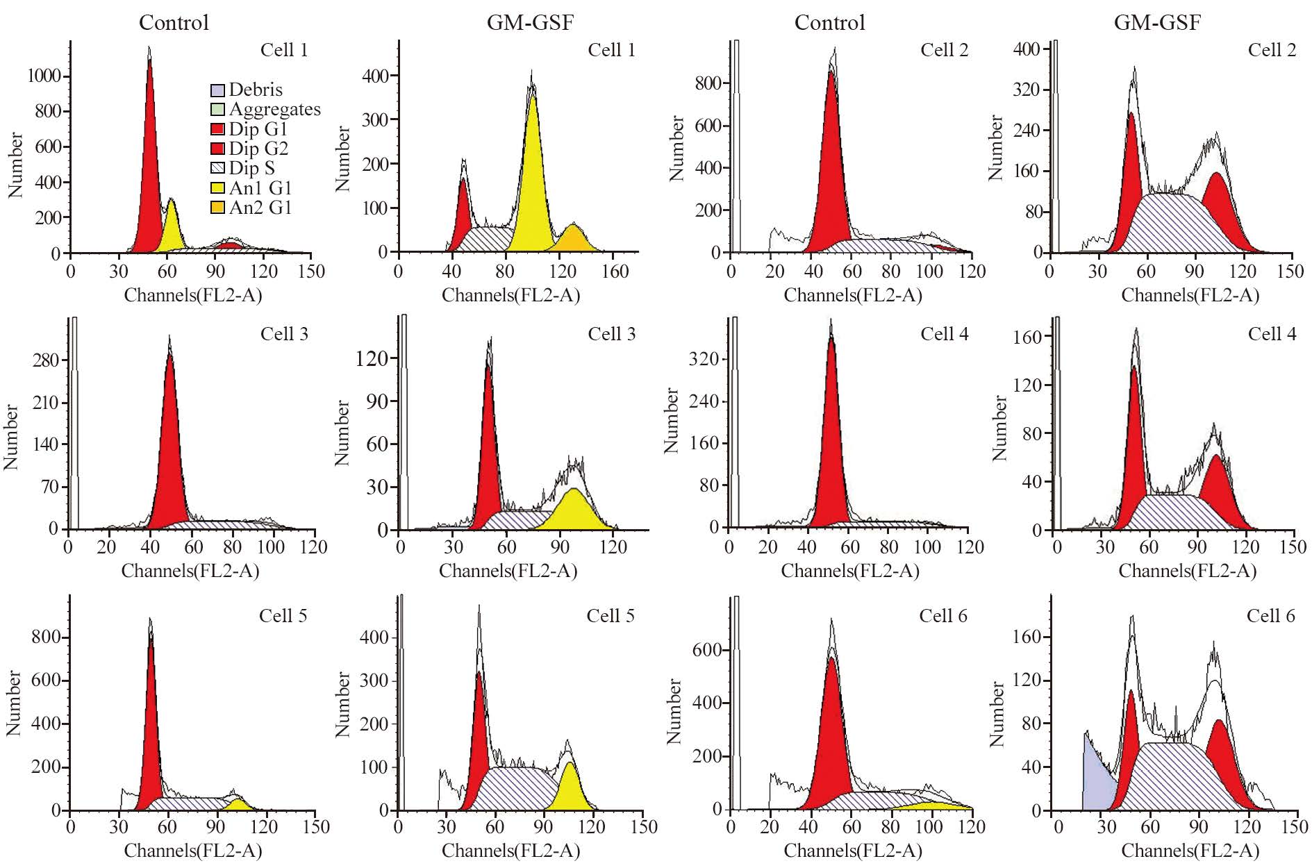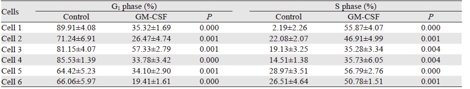 结果显示,与对照组G1期细胞比例相比,48 h后GM-CSF处理组G1期细胞所占比例大幅降低,而GM-CSF处理组S期细胞所占比例较对照组显著增加,6例细胞表现出一致性,并且其差异具有统计学意义(P<0.05),见图 7、表 2。