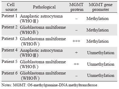1 材料和方法 1.1 实验材料6例高级别胶质瘤细胞来源于人脑胶质瘤组织的培养,见表 1。GM-CSF购自美国Propretech公司,TMZ粉剂来源于默沙东公司,DMEM高糖培养液购自Hyclone公司,胎牛血清购自美国Gibco公司,胰蛋白酶和双抗(青霉素、链霉素)购自北京索莱宝科技有限公司,MGMT抗体购自美国Santa Cruz公司,甲基化特异性PCR试剂盒购自美国Abcam公司,MTT粉剂购自上海碧云天生物技术公司,流式凋亡试剂盒购自美国艾美捷Biovision公司,PI和 RnaseA购自武汉博士德生物公司。
