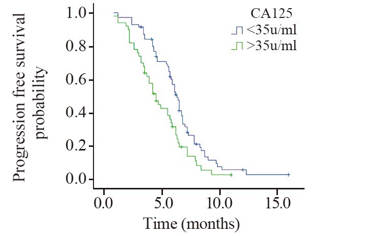血清CA125指标生存曲线见图 2,CA125<35 u/ml水平的患者的中位无疾病进展时间为6.3月,CA125>35 u/ml水平的患者的中位无疾病进展时间为4.5月,两条生存曲线比较差异有统计学意义(P=0.004)。