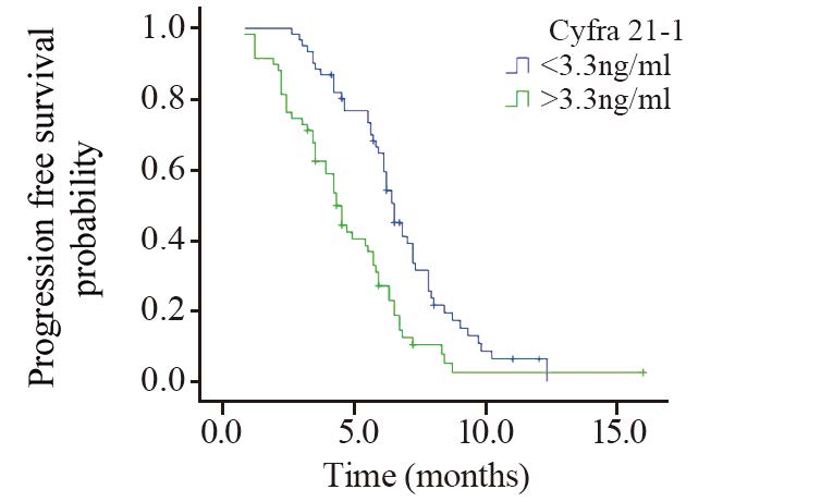 Cyfra21-1是利用鼠的单克隆抗体KS19和BM19-21在人血清中检测细胞角蛋白19的一个可溶性片段。Cyfra21-1是构成细胞的酸性蛋白,主要分布于肺、乳腺上皮,正常人很少分泌,主要由癌变的上皮释放入血。经大量的临床研究资料表明Cyfra21-1是NSCLC患者最有价值的血清肿瘤标志物,对非小细胞肺癌的诊断、病情监测及疗效判断有较高的临床应用价值[14]。本研究发现血清Cyfra21-1在患者疾病一般特征中未见明显差异(P>0.05)。生存分析显示血清Cyfra21-1正常组和血清Cyfra21-1较高组的中位PFS分别为6.5、4.3月,差异有统计学意义(P=0.0009)。