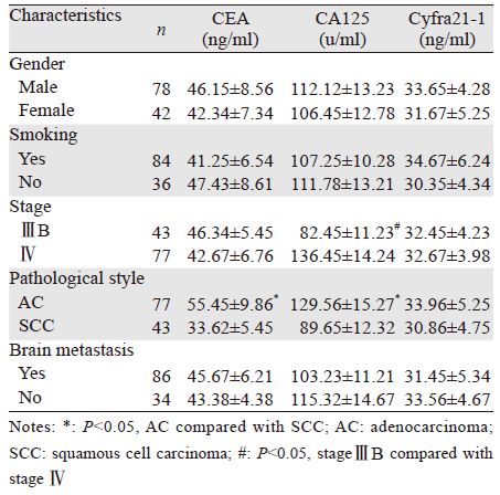 2 结果 2.1 血清CEA、CA125、Cyfra21-1与临床病理特征的关系统计结果显示,血清CEA水平在腺癌患者中明显升高(P=0.002);血清CA125水平在腺癌患者中明显升高(P=0.032),在Ⅳ期患者中也明显升高(P=0.015);血清Cyfra21-1水平在NSCLC患者性别、吸烟史、分期、病理类型、脑转移等特征中差异无明显统计学意义(P>0.05),见表 1。