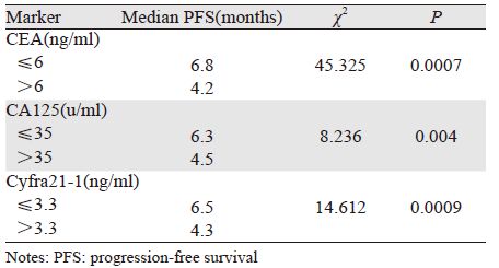 根据相关标准,将CEA、CA125、Cyfra 21-1的正常范围分别定为0~6 ng/ml、0~35 u/ml、0~3.3 ng/ml,大于其临界值则视为肿瘤标志物升高,其中位无疾病进展生存期,见表 2。