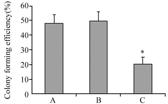 利用平板集落实验来检测单纯放射组、单纯转染组、转染+3Gy放射组的集落形成率,结果显示单纯放射组为(47.81±6.04)%(n=3),单纯转染组为(49.37±6.42)%(n=3),转染+3Gy放射组为(20.19±4.85)%(n=3),其中转染+3Gy照射组与单纯放射组和单纯转染组之间比较差异有统计学意义(P=0.027、 0.013),而单纯放射组和单纯转染组之间比较差异无统计学意义(P=0.436),见图 4。