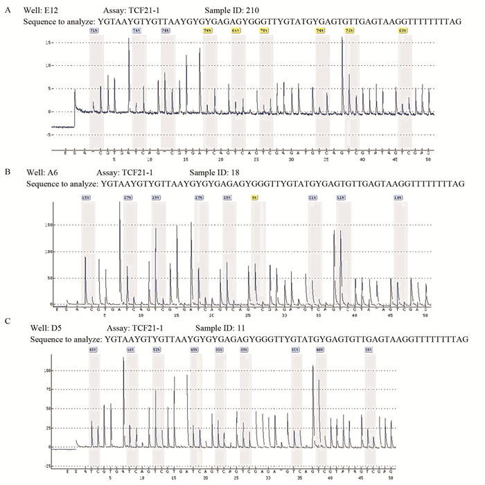 | A: renal cell carcinoma(RCC) tissues; B: normal renal tissues; C: RCC urine specimen 图 1 TCF21启动子甲基化位点焦磷酸测序检测 Figure 1 Pyrosequencing detection of TCF21 promoter methylation site |