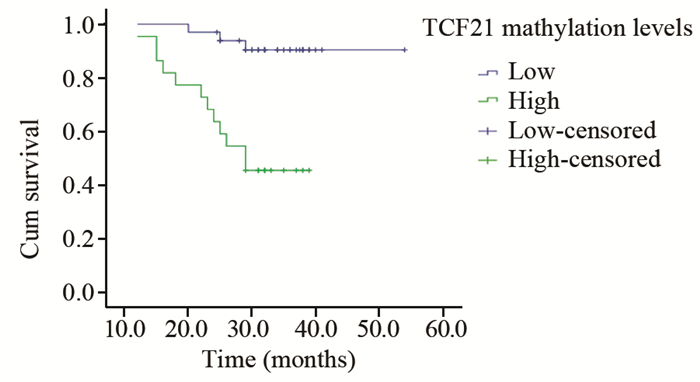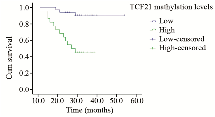 | 图 2 肾癌TCF21甲基化水平相关术后生存率曲线 Figure 2 Postoperative survival rate curves of different methylation levels of TCF21 in RCC tissues |