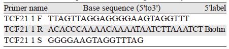 焦磷酸测序检测:(1)分别取40 μl扩增产物至PSQ 96 Plate Low样品制备板A中,各加入40 μl结合缓冲液和5 μl包被有链亲和素的磁珠,将A板放入样品制备板中,振荡10 min。将结合PCR产物的磁珠转移至变性缓冲液的板B中,使双链DNA充分变性。转移结合有单链PCR产物的磁珠至100 μl退火缓冲液的板C涡旋振荡洗涤2 min。(2)测序引物杂交:将结合单链PCR产物的磁珠转入45 μl复性缓冲液中,加入5 μl测序引物,80℃杂交10 min。(3)PSQ96焦磷酸测序仪和测序反应试剂盒(Pyro Gold Reagents)检测TCF21启动子区域内甲基化位点的碱基频率。采用文献报道常用的甲基化指数公式[MI=甲基化的峰值高度/(甲基化的峰值高度+非甲基化的峰值高度)×100%]对该甲基化频率进行计算[13]。