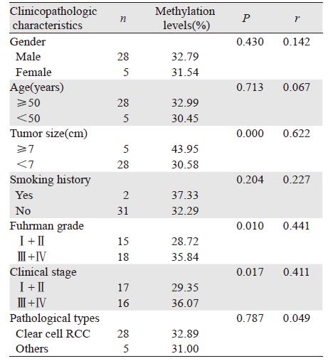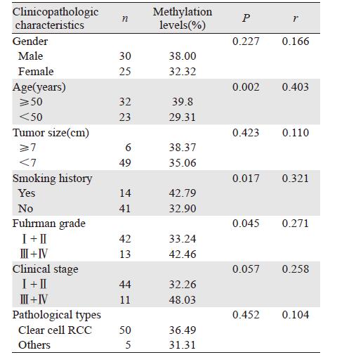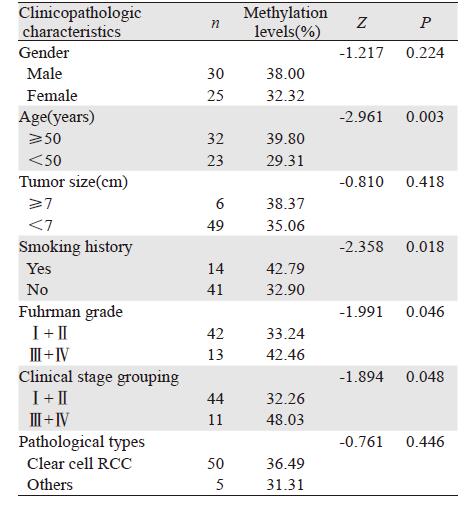 1 资料与方法 1.1 资料选择泉州市第一医院病理科2011年1月—2013年12月手术切除后经病理检查确诊的肾癌石蜡包埋标本,选择标准:(1)首次发现肾癌,并经组织病理学确诊;(2)为单一肾癌,未合并或已排除其他疾病如肾结核、肾结石、肾感染性疾病、肾良性肿瘤、肾盂肿瘤、肾间叶肿瘤、后腹腔其他肿瘤等;(3)术前均未经放疗、化疗、免疫治疗或靶向治疗等抗肿瘤治疗。入组55例肾癌患者包括男30例、女25例;年龄26~86岁,平均年龄52.85岁,以50岁为界分成两组,其中≥50岁有32人,<50岁有23人。按2009年美国癌症联合委员会(American Joint Committee on Cancer,AJCC)肾癌临床分期标准(tumor node metastasis,TNM)分为:Ⅰ期42例、Ⅱ期2例、Ⅲ期11例。按Fuhrman分级,Ⅰ+Ⅱ级共42例,Ⅲ级12例,Ⅳ级1例。肿瘤大小≥7者6例,<7者49例;吸烟者15例、不吸烟者40例;肾透明细胞癌50例、乳头状肾癌2例、多房性囊性癌1例、肾细胞癌Xp11.2易位/TFE3基因融合相关性肾癌1例、嫌色性肾细胞癌1例。在55例肾癌标本中随机选取21例进行切片获取癌旁正常组织(经资深病理科医生看片确定),同时随机留取55例肾癌患者术前尿液样本33例及正常尿液对照组15例进行焦磷酸测序。本研究经过本院伦理委员会批准,所有患者均签署知情同意书。