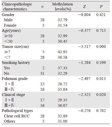 1.5 统计学方法以每个标本中片段的MI均值代表其甲基化水平[14]。由于基因启动子甲基化频率变化不符合正态分布,使用SPSS19.0软件对所检测肾癌患者和癌旁正常肾组织的TCF21甲基化水平进行Mann-Whitney U非参数秩和检验,验证TCF21基因启动子甲基化水平与肾癌的相关性。甲基化水平和临床病理资料如性别、年龄、吸烟史、肿瘤分期分级和肿瘤病理类型之间的关系使用Mann-Whitney检验。相关性由Spearman Correlation评估。釆用Kaplan-Meier的方法绘制TCF21高甲基化组与TCF21低甲基化组患者的生存曲线,并通过Log rank检验,比较不同TCF21甲基化水平患者术后生存率与总生存率(首诊后)有无差异。用接收操作特征(ROC)曲线来测绘真阳性率(敏感度)和假阳性率(1-specificity),并计算曲线下的面积(AUC)。双尾P-values使用计算机辅助程序(SPSS19.0),以P≤0.05为差异具有统计学意义。