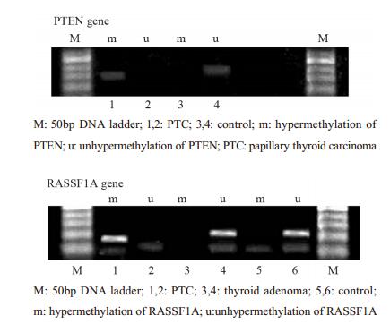 | 图 1 结节性甲状腺疾病患者PTEN、RASSF1A基因启动子区甲基化电泳结果 Figure 1 MSP of PTEN, RASSF1A gene promoter of thyroid nodule disease |