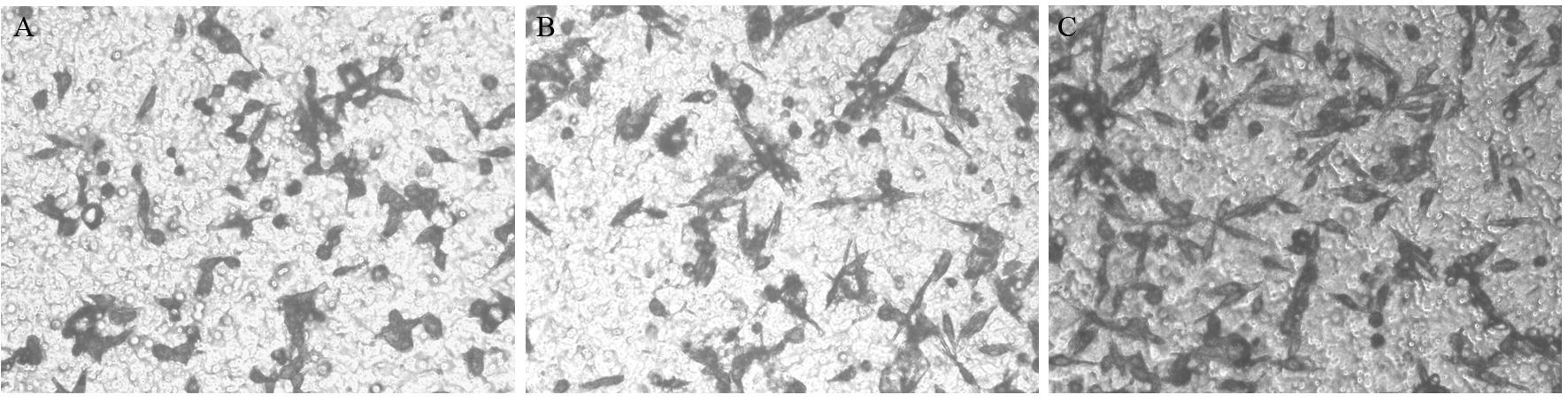 | A: blank control (BC); B: negative control (NC); C: pcDNA3.1-NRP-1 图 6 NRP-1过表达对MDA-MB-231细胞迁移能力的影响 (×400) Figure 6 Migration abilities of MDA-MB-231 cells detected by Transwell (×400) |