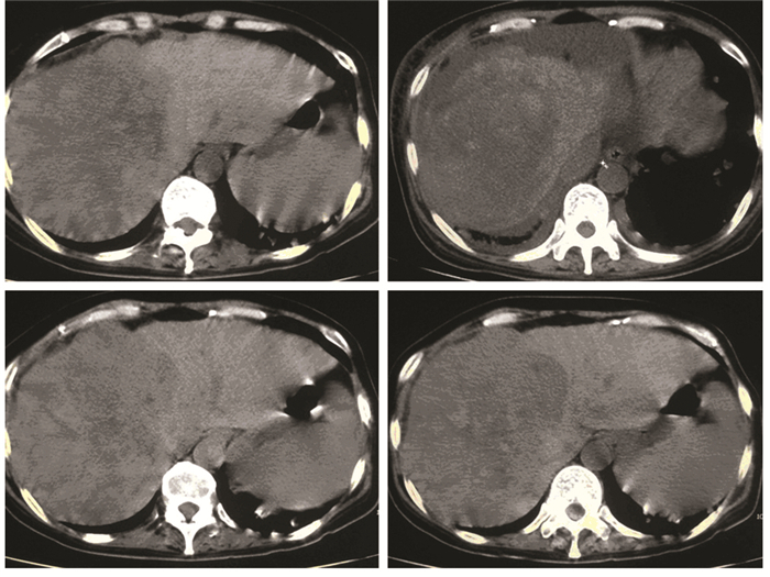 | The CT examination revealed a huge space-occupying lesion of low density, with areas of even lower density inside, suggesting primary liver cancer. No obvious difference was observed before and after treatment 图 1 阿帕替尼治疗前(左)后(右)肝脏肿瘤变化 Figure 1 Change of liver cancer before (left) and after (right) Apatinib treatment |