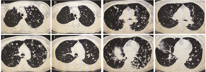 | The CT examination revealed multiple round like nodules in both lungs, indicating metastases. The treatment led to the decrease in both size and numbers of the metastases 图 2 阿帕替尼治疗前(A、C、E、G)后(B、D、F、H)肺转移灶变化 Figure 2 Change of metastatic tumor of lung before (A, C, E, G) and after (B, D, F, H) Apatinib treatment |