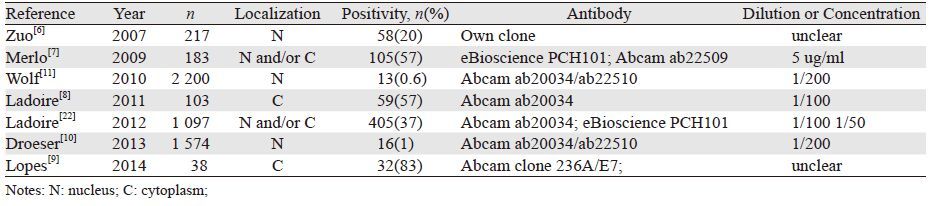 2.2 FOXP3在乳腺癌细胞中的表达程度各项研究显示FOXP3在乳腺癌细胞中的表达程度是不一的。Zuo等[6]考虑FOXP3作为转录因子参与HER2原癌基因的转录调节过程应在细胞核内完成,因而仅将胞核阳性定义为表达阳性,检测到FOXP3在乳腺癌细胞核表达率为20%,低于正常乳腺组织上皮细胞核表达率(80%)。Merlo等[7]报道了Milan 3和Milan 1实验中乳腺癌组织的FOXP3表达率分别占到57%和73%,且细胞内表达部位存在异质性,表现为细胞质为主的表达、细胞质与细胞核均表达或仅细胞核表达。随着研究的进展,Ladoire等[8]检测HER2阳性型乳腺癌细胞质中FOXP3表达率占57%,Lopes等[9]报道了三阴性乳腺癌(triple negative breast cancer, TNBC)细胞质中FOXP3表达率高达83%。FOXP3在TNBC中的表达率高于HER2阳性型乳腺癌,分析可能与FOXP3下调HER2原癌基因相关,表明FOXP3的表达程度可能与分子亚型有关。各项研究中FOXP3的表达率不尽相同,亦有研究几乎未检测到阳性表达。Droeser等[10]在5种乳腺癌细胞系(ZR75-1, MCF7-WH, BT20, T47D, SKBR3)及乳腺癌组织中均未发现有意义的表达水平,胞核表达率仅1%。Wolf 等[11]也报道了更低的胞核表达率(0.6%)。各研究的FOXP3表达率不同可能与判断表达阳性的评价标准、使用的抗体浓度及抗原修复时间不同有关,见表 1。