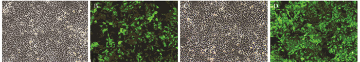 | 图 1 荧光倒置显微镜观察siRNA慢病毒感染后(96h) RKO细胞的白光和荧光表达(×100) Figure 1 The white light and fluorescent expression of RKO cells infected by siRNA lentiviral (96h) observed under fluorescence inverted microscope (×100) |