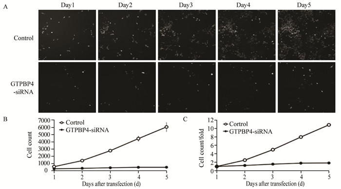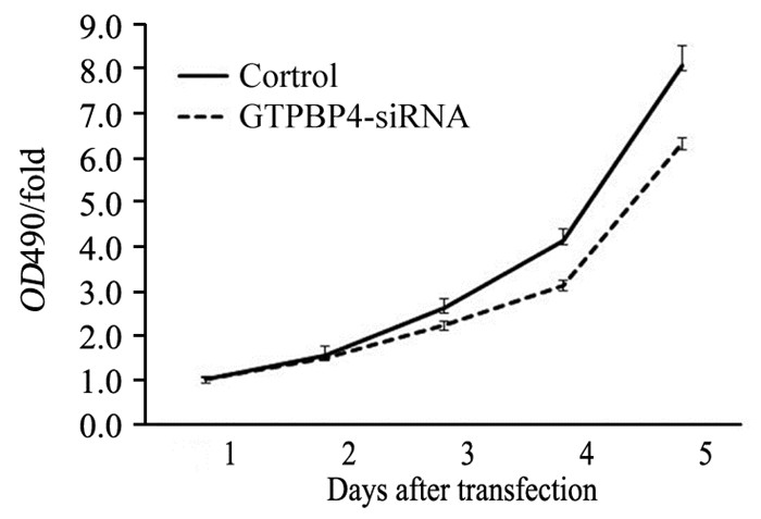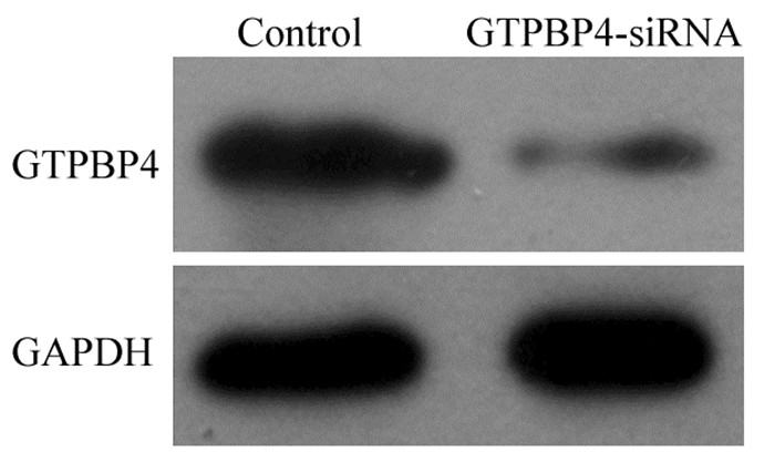 | GTPBP4 protein was significantly decreased in experimental group compared with control group; experimental group: GTPBP4-siRNA group 图 2 Western blot检测转染病毒后实验组与对照组RKO细胞中GTPBP4蛋白表达 Figure 2 GTPBP4 protein in control group and the experimental group detected by Western blot |
