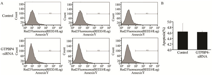 siRNA慢病毒感染后,实验组细胞处于G0/G1期、G2/M期显著增多,S期明显减少,提示GTPBP4基因与RKO细胞增殖周期分布相关,见表 1。