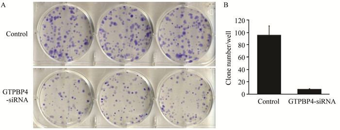 siRNA慢病毒感染后,与对照组相比,实验组RKO细胞集落数目减少,提示GTPBP4基因与RKO细胞的克隆形成能力相关,见图 6。