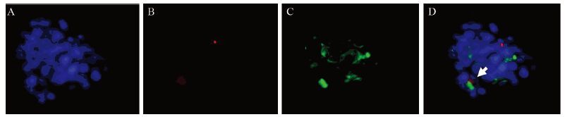 | A: DAPI; B: PKH26; C: CD133; D: Merge 图 1 免疫细胞荧光检测spheroid细胞中PKH26与CD133共染情况 (×400) Figure 1 Co-staining of PKH26 and CD133 in spheroid cells detected by immunofluorescence (×400) |