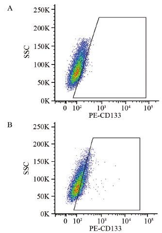 | 图 2 流式细胞荧光检测CD133在A549(A)和A549-V13细胞(B)中的表达 Figure 2 Expression of CD133 in A549(A) and A549-V13 cells(B) detected by flow cytometry |