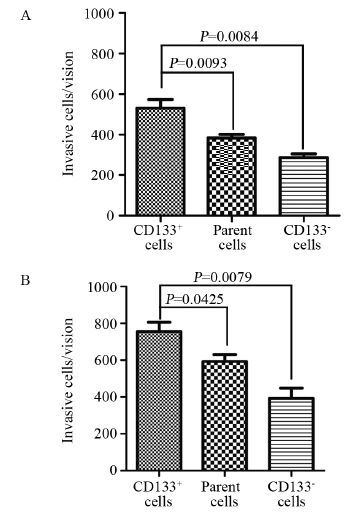 | 图 4 A549(A)和A549-V13(B)的CD133+细胞、CD133-细胞和亲本细胞的侵袭能力分析 Figure 4 Invasion ability of CD133+,CD133- and parent cells in A549(A) and A549-V13 cells(B) |