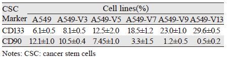 1.6 流式细胞术分选A549、A549-V13中CD133+和CD90+细胞无菌环境中消化细胞为单细胞悬液,PBS洗两次,加入流式细胞标记CD133和CD90抗体,细胞孵育密度为1×107/ml,室温孵育1 h,PBS洗3次,室温孵育60 min,再用PBS洗涤3次,最后用含1%BSA的PBS重悬,流式细胞荧光分选仪检测阳性细胞比例或分选。