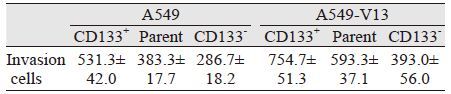 1.8 Transwell侵袭实验检测A549和A549-V13中CD133+细胞侵袭能力分选A549和A549-V13细胞中CD133+、CD133-和亲本细胞,37℃孵育2 h,以4×104个每孔接种于预先包被好Matrigel胶的Transwell上室中,在37℃、5%CO2培养箱中培养24 h后,取下底膜,DAPI染色,封片,在荧光显微镜下观察穿膜细胞并计数。