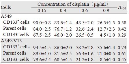 1.9 CCK-8法检测A549和A549-V13细胞中CD133+细胞耐药性将流式细胞仪分选得到的CD133+细胞、亲本细胞、CD133-细胞以2 000个每孔接种于96孔板,每组细胞均用含0、0.15、0.3、0.6、0.9 μmol/L的5种不同浓度顺铂的培养液、37℃、5%CO2培养箱中培养,3 d换液,7 d后按照CCK-8试剂盒说明书加入CCK-8试剂,测定OD450值,用IC50软件计算各组IC50值。