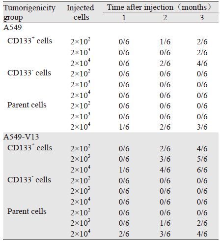 流式细胞术分选A549和A549-V13中CD133+细胞接种至4周龄左右的裸鼠体内,A549-V13中CD133-细胞在观察过程中始终没有出瘤,2月时,2×102个CD133+细胞有2/6致瘤,观察期达3月时,2×102个CD133+细胞即有4/6致瘤,而相同时间内,A549中CD133+细胞组则需2×104个细胞才能有相同的致瘤性,见表 5。说明A549-V13中CD133+细胞的致瘤性较A549中CD133+细胞强100倍,见表 5。该实验结果提示,A549-V13中CD133+细胞因富含有肿瘤干细胞而表现出强致瘤性,亲本细胞中因含较低比例的肿瘤干细胞表现出较弱的致瘤性,而CD133-组则因缺乏肿瘤干细胞而没有表现出致瘤性,即CD133+细胞的强致瘤性符合肿瘤干细胞判定的“金标准”。因此,我们认为A549-V13中CD133+细胞为肿瘤干细胞。