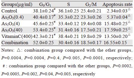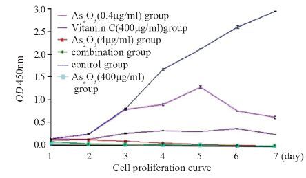 1.2 实验分组分为6组,其中As2O3组分为3组,分别加入0.4 μg/ml、4 μg/ml(临床常用量)、40 μg/ml的As2O3;维生素C组加入400 μg/ml(临床常用量)的维生素C;联合组加入400 μg/ml维生素C+0.4 μg/ml As2O3,对照组不做特殊处理。