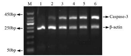 | M: marker; 1: control group; 2: vitamin C(400μg/ml) group; 3: As2O3(0.4μg/ml) group; 4: As2O3(4μg/ml) group; 5: As2O3(40μg/ml) group; 6: combination group(400μg/ml vitamin C+0.4μg/ml AS2O3) 图 2 48 h后不同药物组中caspase-3因子的表达 Figure 2 Expression of the caspase-3 gene in different groups after 48h of culture |