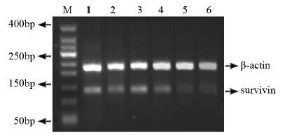 | M: marker; 1: control group; 2: vitamin C(400μg/ml) group; 3: As2O3(0.4μg/ml) group; 4: As2O3(4μg/ml) group; 5: As2O3(40μg/ml) group; 6: combination group(400μg/ml vitamin C+0.4μg/ml As2O3) 图 3 48 h后不同药物组中survivin因子的表达 Figure 3 Expression of the survivin gene in different groups after 48 h of culture |