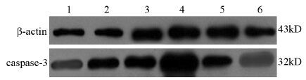 | 1: As2O3(40μg/ml) group; 2: As2O3(4μg/ml) group; 3: As2O3(0.4μg/ml)group; 4: control group; 5: vitamin C(400μg/ml) group; 6: combination group(400μg/ml vitamin C+0.4μg/ml AS2O3) 图 4 48 h后不同药物组中β-actin、caspase-3蛋白的表达 Figure 4 Expression of the β-actin and caspase-3 protein in different groups after 48 h of culture |