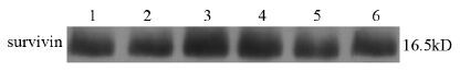 | 1: control group; 2: vitamin C(400μg/ml) group; 3: As2O3(0.4μg/ml) group; 4: As2O3(4μg/ml) group; 5: As2O3(40μg/ml) group; 6: combination group(400μg/ml vitamin C+0.4μg/ml As2O3) 图 5 48 h后不同药物组中survivn蛋白的表达 Figure 5 Expression of the survivin proteins in different groups after 48 h of culture |