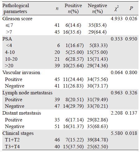 1 资料与方法 1.1 资料病例组86例标本均取自2011—2015年间在广西医科大学第四附属医院泌尿外科行前列腺穿刺或手术切除的标本,并同时经我院病理科两位高年资病理医师诊断均为前列腺腺癌,术前未接受手术去势、药物去势或放化疗治疗。患者年龄50~88岁,平均年龄为(70.5±6.9)岁,参照《2014版中国泌尿外科疾病诊断指南》,按以下方法分组:(1)Gleason评分:根据评分分成两组(高-中分化组:≤7分、低分化组:>7分);(2)PSA值:分为4组(<4、4~10、>10~20、>20 ng/ml);(3)脉管侵犯:分成有脉管侵犯和无脉管侵犯2组;(4)淋巴结转移:分成有淋巴结转移和无淋巴结转移两组;(5)远处转移:分成有远处器官转移和无远处器官转移两组;(6)临床分期:分为T1+T2组和T3+T4组。对照组80例标本取自同时期在我院就诊的经穿刺或手术切除的前列腺增生标本,年龄55~85岁,平均年龄为 (71.7±7.3)岁。两组年龄比较差异无统计学意义。