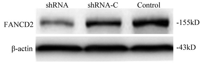 1 材料与方法 1.1 材料 1.1.1 细胞株实验组含有效FANCD2 shRNA干扰序列的人HNSCC细胞SIHN-005A(shRNA组)、含无效干扰序列的SIHN-005A阴性对照组细胞(shRNA-C组)及野生型SIHN-005A空白对照组细胞株(Control组),由西南医科大学附属医院耳鼻咽喉头颈外科覃纲博士在英国牛津大学Weatherall分子医学研究所Stephan M. Feller博士研究小组实验获得。